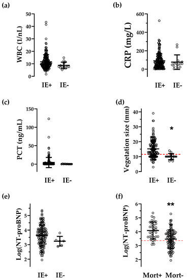 Intergroup differences for quantitative parameters. Scatter plots of serum markers for inflammation (WBC, CRP and PCT, a–c), of a marker for cardiac stress (NT-proBNP, (d) and of the vegetation size (measured by transesophageal echocardiography, (e) in patients who underwent operative therapy for IE with confirmed (IE+) or rejected (IE-) diagnoses for IE. (f): Patients with positive (Mort+) vs. negative mortality (Mort-) after 1 year of follow-up. Red dotted lines represent the optimal cut-off values for vegetation size (d) and log(NT-proBNP) (f), comparison of Table 3 and Table 4b. Bars represent the mean ± SD. * p < 0.01, ** p <0.0001, Student’s t-test. Abbreviations as in Table 1.