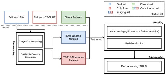Schematic representation of the study workflow. Follow-up DWI and T2-FLAIR scans are preprocessed and radiomic features are extracted from the segmented lesions. Five different sets of features are then used to train an ensemble tree-based ML classifier to predict binary 90-day mRS (0–2 vs. 3–6). Each set respectively includes: (1) only DWI radiomic features (DWI set), (2) only T2-FLAIR radiomic features (FLAIR set), (3) both DWI and T2-FLAIR radiomic features (imaging set), (4) only clinical characteristics (clinical set), and (5) a combination of all the radiomic features and the clinical characteristics available up to 24 h (combination set). Finally, the models’ interpretability is evaluated using SHapley Additive exPlanations (SHAP).