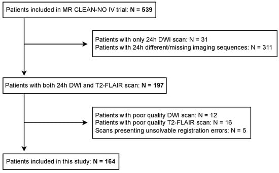 Figure 2 shows a flow-chart of the patient inclusion process. We included patients with high-quality follow-up DWI and T2-FLAIR scans, resulting in 164 patients from MR CLEAN-NO IV trial. Scans presenting severe artifacts were excluded from this study.