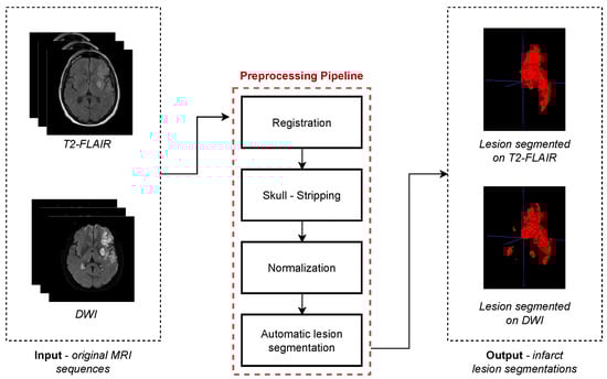 Image preprocessing pipeline. The same steps are repeated for each of the input MR sequences, obtaining the infarct lesion segmentation as the final output from both imaging sequences.