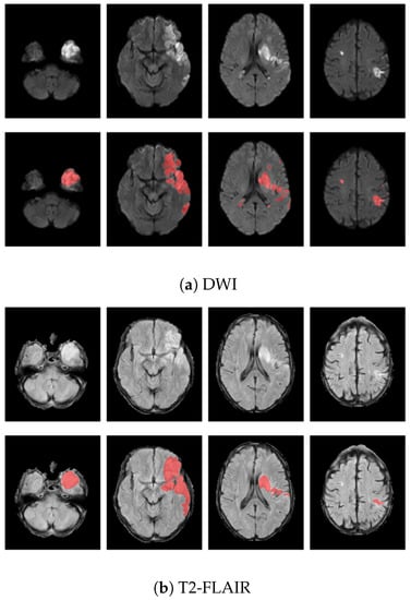 Example of infarct lesion segmentation on a selected slices sampled from (a) DWI and (b) T2-FLAIR preprocessed volumes. For each modality, original slices are displayed in the first row and lesion segmentation (red) is shown as overlapping the correspondent slices in the second row.