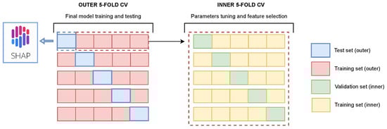 Because the analyzed sample size is relatively small, nested stratified k-fold cross validation (CV) was used to train and test the model in order to avoid biases and overly-optimistic results. The schema of the experimental setup is shown in Figure 5, where the outer and inner loops are schematically represented on the left and right, respectively. In our pipeline, k was set to 5, meaning that that 20% of the dataset is used as a test set at each split. In the inner CV, a grid-search strategy was implemented to tune the model’s parameters (, , , , , , ) in order to maximise validation accuracy. A detailed description of the parameters is available in the official documentation [27]. For each feature, mean absolute SHAP values were computed on each validation set of the inner loop. The average SHAP values at the end of inner CV were used to obtain the final feature importance ranking. All the features with a mean absolute SHAP value equal to 0 where automatically discarded. For each round of the outer CV, the final model with the selected parameters and features was retrained on the whole outer training set and tested on the unseen test set to assess the model’s generalization capabilities.