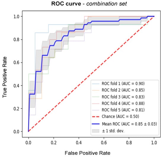 Average ROC curve (blue) obtained from the outer cross-validation of the best-performing model (combination set).