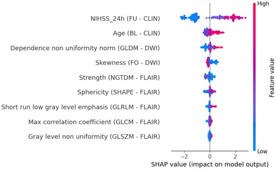 Figure 7 shows the SHAP summary plot of the most important features with the largest impact on outcome prediction for the best experiment (combination set). The features with the largest impact include both clinical characteristics and radiomic features. It can be seen that both DWI and T2-FLAIR radiomic features are ranked among the most relevant predictors, with texture features the most frequent ones. The only exceptions are Skewness measured on DWI, which is a first-order feature and an indicator of asymmetry in gray level distribution, and Sphericity measured on T2-FLAIR, which is a shape-related feature measuring the roundness of the shape of the lesion region. All the other image predictors are texture features, and despite the different textural matrices being able to capture slightly different aspects of gray values distributions, they are essentially describing the heterogeneity of the examined region (a detailed description of each feature is reported in the official documentation [28]). The beeswarm plot shows that more heterogeneous lesions (↑ Dependence non uniformity, GLDM–DWI; ↓ Strength, NGTDM–FLAIR; ↑ Short run low level emphasis, GLRLM–FLAIR; ↑ Max correlation coefficient, GLCM–FLAIR; ↑ Gray level non uniformity, GLSZM–FLAIR) are more associated with unfavorable clinical outcomes.