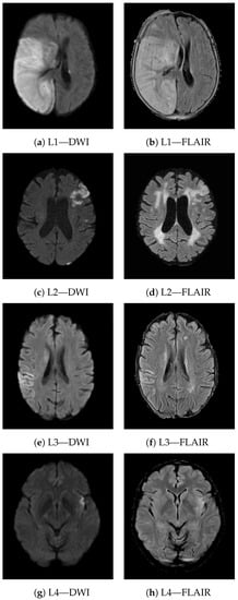 Figure 8 shows four different study cases (L1-4) demonstrating the meaning of texture heterogeneity for visual inspection. For each lesion, the axial view from both DWI and T2-FLAIR modality is reported. The lesion appears hyperintense on both imaging sequences. L1 and L2 are two examples of lesions from patients experiencing poor long-term functional outcome (90-day mRS of 6 and 5 respectively). L1 is a very severe case; the extension of the lesion is quite large, involving both GM and WM and presenting PH1 hemorrhage. L2 is less extensive compared to L1, although it too involves both GM and WM. Patients with worse outcomes present more heterogeneous lesions, often involving both GM and WM. In the presence of hemorrhage, heterogeneity in terms of radiomic features is even higher (e.g., texture heterogeneity measured in terms of Dependence non uniformity normalized—GLDM on DWI was 0.23 and 0.13 in L1 and L2, respectively). On the other hand, in patients that achieved functional independence (e.g., L3 and L4 presented a 90-day mRS of 2 and 0, respectively), the lesions were less heterogeneous (texture heterogeneity in terms of Dependence non uniformity normalized—GLDM on DWI of 0.08 and 0.04, respectively), and mostly involved GM areas.