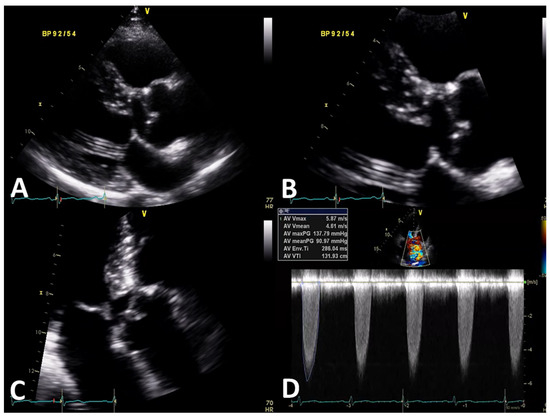 Transthoracic echocardiographic image showing a parasternal long-axis view (A,B), apical four-chamber view of the aortic valve (C), and continuous-wave Doppler across the aortic valve (D).