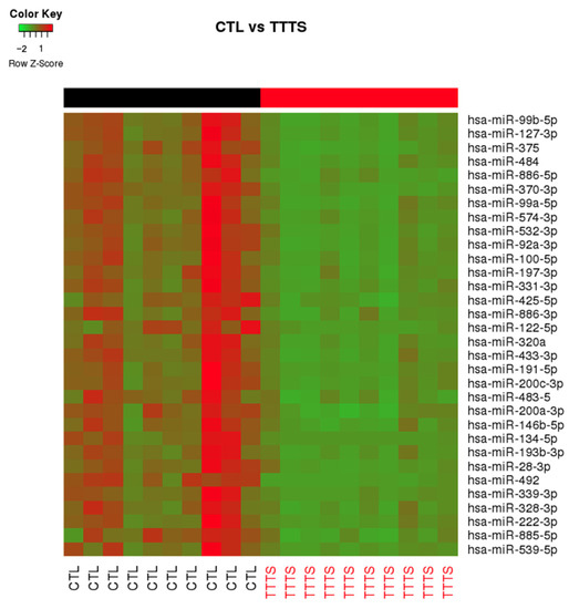 After normalization, classification of miRNAs was performed using R (www.R-project.org, accessed on 25 November 2019). Heat maps were generated based on t-test Wilcoxon of miRNAs with a q-value < 0.0025 using a function in R. Random Forest (RF) analysis was used to identify the top 3 miRNAs that differentiated TTTS from singleton controls. Area under the receiver operating characteristic curve (AUC) was calculated in R. ROC curve were generated to determine the sensitivity and specificity of the top 3 differentiating miRNAs [22].