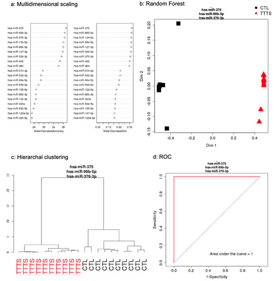 Amniotic fluid miRNAs differentiated TTTS subjects (n = 10) from singleton controls (n = 10). (a) Rank of most important miRNAs by multidimensional scaling. (b) Random forest (RF) analysis demonstrated that miR-99b, miR-370 and miR-375-3p differentiated the two groups. (c) Hierarchal clustering showed separation between the TTTS and controls. (d) Receiver operating curves using the top 3 miRNAs showed an area under the curve of 1.