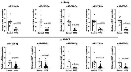 Bar graphs of 5 differentially expressed miRNAs from miRNA arrays (a) and RT-PCR (b). p-values displayed reflect individual comparisons. Individual miRNAs selected based on q < 0.0025. (a) Relative miRNA expression of select miRNAs among TTTS subjects n = 10 and singleton controls n = 10. (b) Relative miRNA expression of select miRNAs by RT-PCR utilizing miRNA-363 as a normalizer. TTTS n = 50, singleton controls n = 7.