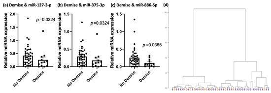 (a–c) Bar graphs comparing relative expression of miRNA-127-3p (p = 0.0324), miRNA-375-3p (p = 0.0324) and miRNA-886-5p (p = 0.0365) between TTTS fetuses with demise versus survival to delivery (no demise). (d) Hierarchal cluster demonstrating the sorting of TTTS subjects by demise status (demise shown as orange ‘D’, survival as purple ‘S’).