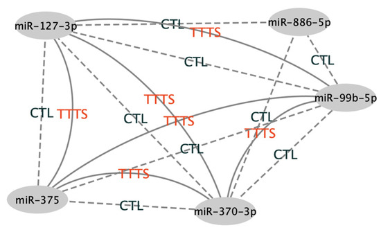 Network analysis was used to determine the relationship of miR-99b-5p, miR-127-3p, miR-375, miR-886-5p and miR-370-3p. As shown in Figure 5, a correlation was observed between all miRNAs in TTTS subjects with the exception of miR-886-5p. In control subjects, miR-886-5p correlated with miR-370, miR-127-3 and miR-99b. Neither controls nor TTTS subjects had a correlation between miR-886-5 and miR-375.