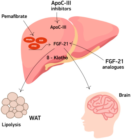 Based on the abovementioned beneficial effects, FGF21 analogues are being evaluated as potential therapeutic agents for NASH and hypertriglyceridemia. In a phase two, randomized, double-blind, placebo-controlled trial, the efficacy and safety of BIO89-100 administrated sc weekly or every two weeks in 90 individuals with severe hypertriglyceridemia (TG > 500/1.7 mmol/L and <2000 mg/dL/22.5 mmol/L) are currently being evaluated. The primary outcome of the study is the percentage change in TG levels at week 8, while the secondary outcomesinclude percentage alterations in VLDL-C, LDL-C, non-HDL-C, HDL-C, apoB-100, remnant lipoprotein cholesterol, high-sensitivity C-reactive protein, and fasting adiponectin [30]. Overall, FGF21 analogues appear to have beneficial effects in metabolic derangements, including lipoprotein metabolism. These agents are promising therapeutic options for NASH, a common metabolic disorder for which there is an unmet clinical need, as well as for hypertriglyceridemia.