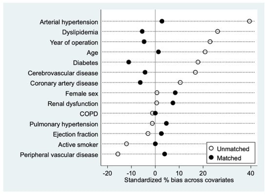 Patients who had PPM/severe PPM were matched 1:1 with a 0.2 standard deviation caliper, using matching without replacement by means of the “psmatch2” statistical package in Stata, to those not exhibiting PPM/severe PPM. Matching covariates were chosen that could alter long-term survival and were the following: year of operation, age, sex, ejection fraction, severe pulmonary hypertension, coronary artery disease, dyslipidemia, arterial hypertension, active smoking, chronic obstructive pulmonary dysfunction, renal dysfunction, diabetes, peripheral vascular disease, and cerebrovascular disease. Covariate balance after matching was assessed by computing the standardized % bias, with less than 10% considered acceptable (Figure 1).