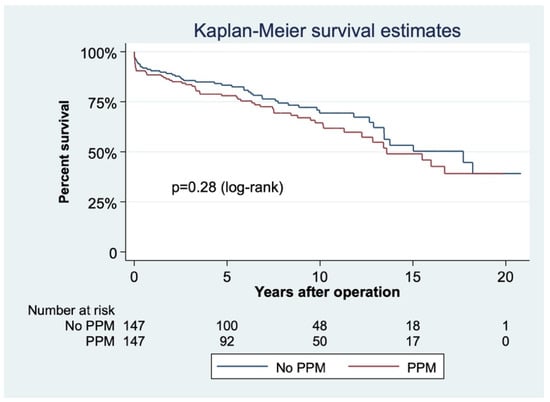The matched cohort had 2287 patient-years of follow-up (7.78 ± 5.26 years). Median follow-up in this cohort was 7.41 years (3.27, 11.14). Time from the primary procedure was 9.92 years (6.79, 12.91). Five- and ten-year survival were 78 ± 3.52% and 64.51 ± 4.51% in patients with PPM versus 83.3 ± 3.12% and 69.37 ± 4.36% in patients without it (p = 0.28, Figure 2) when matching for preoperative variables.