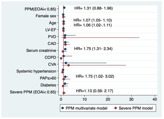 Independent risk factors for impaired long-term survival. The numbers represent the hazard ratio (HR) and the 95% CI. LVEF = left ventricular ejection fraction; PVD = peripheral vascular disease or carotid stenosis >50%; CAD = a stenosis of at least 50% in a major epicardial coronary vessel; COPD = chronic obstructive pulmonary disease diagnosed by spirometry and/or under inhalatory medication; CVA = previous cerebrovascular accident. PAPs = systolic pulmonary artery pressure.