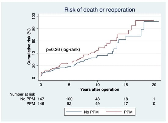 The secondary endpoint of survival without death or reoperation was met at 10 years by 69.37 ± 4.36% of patients without PPM and by 63.90 ± 4.57% of those with PPM in the matched population (p = 0.26, Figure 4).