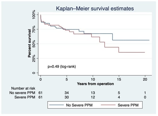 Propensity matching yielded two groups of 61 subjects that either exhibited severe PPM or not. Early mortality was 9.84% and was similar between patients with severe PPM (8.20%) or without (11.48%, p = 0.54). The predicted mortality was 1.92 ± 1.72 (p < 0.01). The matched cohort had 745 patient-years of follow-up (6.10 ± 4.86 years). Time from the primary procedure was 7.17 years (4.93, 11.28). Long term-survival in patients with severe PPM was 73.34 ± 6.01% and 61.76 ± 8.17% at 5 and 10 years, respectively, versus 74.72 ± 5.68% and 67.50 ± 7.09% in those without (p = 0.49, Figure 5).