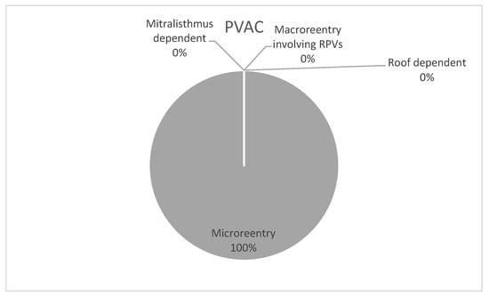 The LAT cycle lengths (CL) ranged between 220 and 370 ms, with a mean of 252 ± 36 ms. Forty-five percent of the LAT patients had persistent AF at the time of the index PVI, and the mean left atrial volume (LAVI) was 40 ± 11 mL/m2 (see Table 2 and Figure 1 for the detailed characteristics and comparative occurrence rates of different LAT mechanisms). Figure 2 shows the percentages of PV reconnections in the LAT patients.