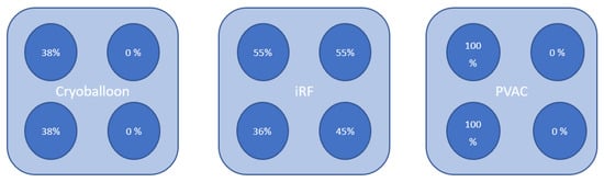 - PVAC group: Ablation with the PVAC system was performed using the second-generation catheter, the PVAC GOLD (Medtronic Inc., Minneapolis, MN, USA). The PVAC was connected to the GENius (Medtronic Inc.) RF generator. The target temperature was 60 °C, with a maximum power of 8 W. Duty-cycled energy delivery was exclusively delivered in a 4:1 ratio, and the impulse duration was 60 s. Electrode pairs with insufficient tissue contact were selectively deactivated. After RF applications, the PVAC was rotated around the PV ostium, looking for the earliest pulmonary vein potential (PVP) to completely isolate the vein. Finally, the catheter electrodes were advanced in the PV demonstrating the entrance block; the exit block was not routinely checked for. No other catheters were used for touch-up lesions. No further ablations were performed.