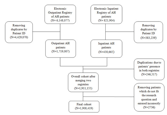 This is a retrospective cohort study of the population diagnosed with arterial hypertension documented in outpatient and/or inpatient setting in Kazakhstan. The data were extracted from the Unified National Electronic Health System (UNEHS), which is a nationwide electronic healthcare system, obtaining health records from medical organizations and their provision at the national level. The initial cohort consisted of 821,904 entries from electronic registry of inpatient data (ERID) and 6,148,077 observations from electronic registry of outpatient data (EROD). A total raw data of 6,969,981 patients with AH existing in UNEHS between 2014 and 2019 were extracted from both ERID and EROD using ICD-10 codes I10 (essential (primary) hypertension). After combining the two databases, duplicate records with the same population registry number (RPN ID) were removed. Finally, 1,908,419 out of 6,969,981 patients had been included for further statistical evaluation (Figure 1).