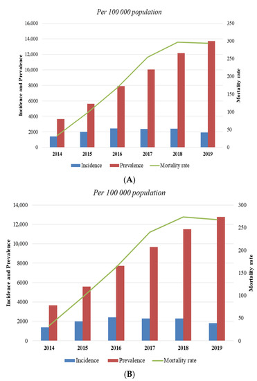 The Figures S1–S3 (Supplementary Material) present absolute, crude, and adjusted (sex and age) rates and interpret the data gathered on the incidence for men and women, place of residence of the patients (urban and rural) in the Republic of Kazakhstan per 100,000 inhabitants. From 2014 to 2019, there is a consistent growth in the number of cases, especially among women living in the city. It reached its peak in both figures (Figures S2 and S3) in 2016, showing a crude rate of 2835.1 per 100,000 population for female and 2010 per 100,000 population for male, while the urban rate of 2418.6 per 100,000 population was also high with a lower rate for rural 1685.3 per 100,000 population.