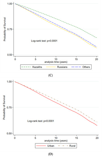 Unadjusted Kaplan–Meyer graphs of hypertension in Kazakhstan by gender (A), age category (B), nationality (C), and place of residence (D).