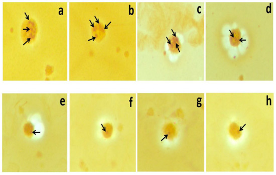 Nucleolar-organizing regions (NORs) are the site of the ribosomal genes composed of ribosomal DNA (rDNA) and proteins; some of them have argyrophilic features. After silver staining, NORs can especially be localized as black spots along the nucleolar space and are termed “AgNOR”. Different studies on the importance of AgNOR proteins were performed in various cells such as hair root cells [6], buccal epithelial cells [7], lung cells [8], myocytes [9,10], muscle cells [11], etc. In those studies, the levels of AgNOR protein increased depending on the hypoxic condition caused by CO exposure and may have had protective effects against hypoxic conditions [9,10].