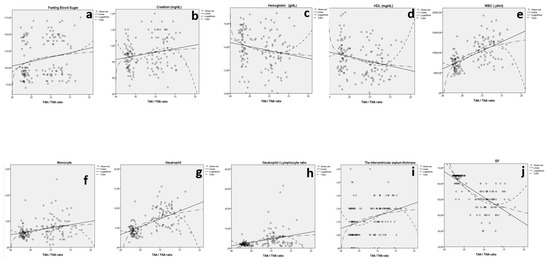 The relation between fasting blood sugar and TAA/TNA ratio (a), creatinine and TAA/TNA ratio (b), hemoglobin and TAA/TNA ratio (c), HDL and TAA/TNA ratio (d), WBCs and TAA/TNA ratio (e), monocytes and TAA/TNA ratio (f), neutrophils and TAA/TNA ratio (g), neutrophil/lymphocyte ratio and TAA/TNA ratio (h), IVST and TAA/TNA ratio (i), and EF and TAA/TNA ratio (j) for both groups.