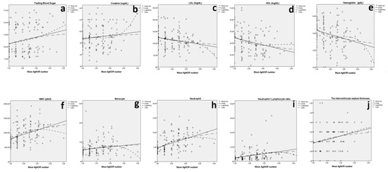 The relation between fasting blood sugar and the mean AgNOR number (a), creatinine and the mean AgNOR number (b), LDL and the mean AgNOR number (c), HDL and the mean AgNOR number (d), hemoglobin and the mean AgNOR number (e), WBCs and the mean AgNOR number (f), monocytes and the mean AgNOR number (g), neutrophils and the mean AgNOR number (h), neutrophil/lymphocyte ratio and the mean AgNOR number (i), and IVST and the mean AgNOR number (j) for both groups.