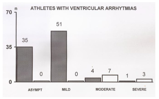 Occurrence of premature ventricular beats according to the severity of clinical presentation. Asympt = asymptomatic and pauci-symptomatic athletes. Hatched bars indicate arrhythmias detected at the ergometric test; white bars indicate arrhythmias detected during 24 h ECG monitoring.
