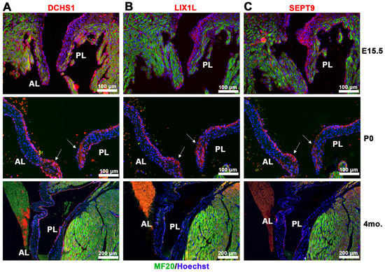 Spatio-temporal expression of DCHS1-LIX1L-SEPT9 proteins throughout development. IHC staining of (A) DCHS1, (B) LIX1L and (C) SEPT9 (red), MF20 (green), and nuclei (Hoechst, blue) on sister sections of E15.5, P0 and four-month-old wildtype mouse valve tissue reveals similar expression throughout the interstitium with localization to the leaflet tips by P0 (arrows) and restriction to the endothelium through adulthood. AL = anterior leaflet, PL = posterior leaflet.