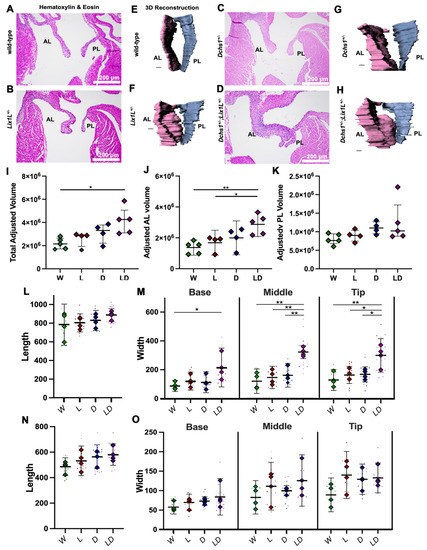 Epistasis analysis reveals DCHS1-LIX1L genetic interaction at postnatal day zero. (A–D) Hematoxylin and eosin (H&E) staining and (E–H) 3D reconstructions of postnatal day zero (P0) mitral valves isolated from wildtype (W), single heterozygote (LIX1L+/−, L or DCHS1+/−, D) and compound heterozygote (LIX1L+/−;DCHS1+/−, LD) mice reveal thickening of single heterozygote and compound heterozygote anterior leaflets (AL) compared to wildtype control littermates. (I–K) Total mitral valve volume measurements from 3D-reconstructed leaflet surfaces demonstrate a significant increase in compound heterozygotes AL leaflets compared to wildtype, with no significance observed in posterior leaflet (PL) volumes. Two-dimensional measurements of length (L,N) and width (M,O) along the leaflet reveals that changes in leaflet volume are due to significant leaflet thickening in the base and tip of the (L,M) anterior leaflets of compound heterozygotes versus single heterozygotes or wildtypes. (N,O) No significant differences were observed in the posterior leaflet of these mice. N = 4–5 animals per genotype, 2D measurements completed on four sections per animal and depicted by dots, averages are plotted as diamonds, * p < 0.05, ** p < 0.005 with One-Way Anova.