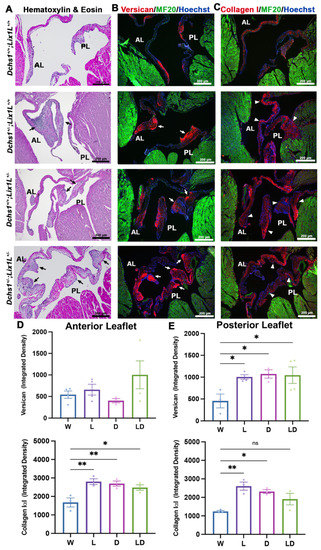 To test whether altering developmental interactions between DCHS1 and LIX1L was sufficient to engender an adult disease phenotype, echocardiographic and histopathology was performed on adult mice (3, 6 and 11 months). Echocardiography revealed slightly increased prevalence (data not shown) of observed prolapse of either the anterior and posterior leaflets in compound heterozygotes compared to single heterozygotes. Furthermore, measurements of 2D images revealed significant increases in left atrium diameter, a potential surrogate marker or physiological consequence of mitral regurgitation [18,19] (Figure S2). In concordance with observed leaflet thickening in echocardiographic images, histopathological analyses performed on 11-month-old tissue revealed significant enlargements and bulging along both leaflets in single and compound heterozygotes as observed with H&E staining (Figure 4A). Disorganized and increased extracellular matrix deposition, also known as myxomatous degeneration, has been observed in patients and mice with MVP [20] and was assayed with immunohistochemical staining of collagen I and versican. Significant increases in both collagen I and versican were observed in single and compound heterozygotes along the anterior and posterior leaflets (Figure 4) and support previous ECM phenotypes observed in DCHS1+/− mice [3] and in pre-valvular cells derived from MVP patients with p.R2330C SNV [21]. Together, these data demonstrate that DCHS1-LIX1L interactions are critical for ensuring proper regulation of valve tissue structure in vivo.
