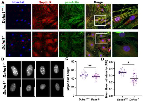 The well-established function of SEPT9 in actin cytoskeleton dynamics [23] indicated a potential pathway in which changes in DCHS1 at the cell membrane could influence cytoskeletal dynamics through LIX1L-Septin 9 interactions. To initially test the effect of DCHS1 on the septin-actin cytoskeleton, interstitial fibroblasts from DCHS1−/− mice at P0 were plated and stained for Septin 9 (SEPT9) and total actin. As shown in Figure 5, control cells have a near perfect overlay of anisotropic actin stress fibers and SEPT9 filaments. Consistent with these mature stress fibers, we also observe an elongated cell phenotype and stretched nuclei, indicative of intracellular tension. In the DCHS1−/− cells, however, only isotropic actin staining is observed at the cell periphery, with a near-complete loss of filamentous SEPT9 (Figure 5A). Additionally, the cell shape of DCHS1−/− cells resembles that of immature mesenchyme with disorganized actin fibers. Roundness of nuclei, an indicator of loss of intracellular tension [25], was also observed in DCHS1−/− cells, likely as a consequence of cytoskeletal disorganization. Quantification of nuclei length and DNA intensity revealed significant decreases in both in DCHS1-deficient CFs compared to controls (Figure 5B,C). These data support a mechanism by which the DCHS1-LIX1L-SEPT9 (DLS) complex regulates cell shape by promoting actin polymerization and stress fiber formation.