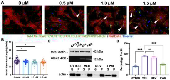 To directly target the LIX1L-SEPT9 interaction in vitro, we synthesized a decoy peptide containing the identified LIX1L binding domain on SEPT9 (TKWGTIEVENTTHCEFAYLRDLLIRTHMQNIKDIT) and fused it to a cell permeating sequence (TAT: GRKKRRQRRRPQ) [26,27], biotin, and 5-carboxyfluorescin (5-FAM) with an excitation maximum in the 488 nm spectral line. This combination allowed for cell permeance and detection of peptide delivery into the cell, which was expected to compete with endogenous SEPT9 to bind LIX1L, resulting in release and destabilization of SEPT9. Dose-dependent decreases in nuclei elongation were observed with increasing peptide dosage, indicating a loss of intracellular actin polymerization and organization (Figure 6A,B). To test whether formation of new F-actin was affected when formation of the DLS complex was disrupted using the inhibitory peptide, cVICs were seeded at 50% confluence and treated with Cytochalasin-D to destabilize actin filaments and then treated with serum containing media with either vehicle (DMSO), forward (FWD) or reverse (REV) peptide to stimulate F-actin polymerization [28]. Actin polymerization was measured with an F/G-actin assay, and significant reductions in F-actin recovery were observed in cells treated with inhibitory peptide compared to reverse peptide or vehicle (Figure 6C,D). These data demonstrate that the LIX1L-SEPT9 interaction is, in part, necessary for the polymerization of F-actin in valve interstitial cells and support a molecular basis for cell organization in the valve tissue.