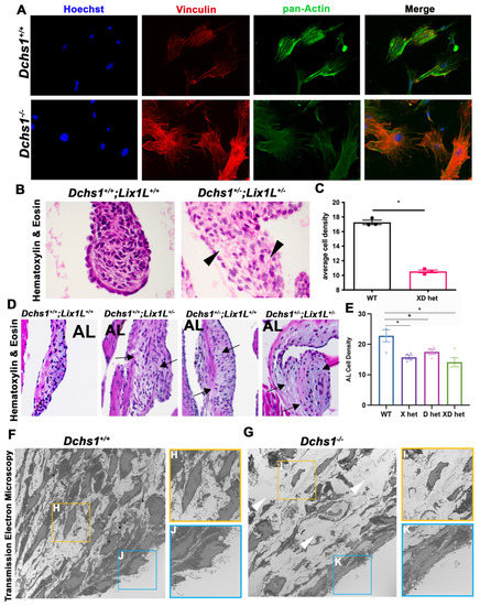 Consequences of actin defects. (A) ICC of vinculin (red), pan-actin (green), and nuclei (Hoechst, blue) in wildtype (DCHS1+/+) and DCHS1 KO (DCHS1−/−) reveals loss of stress fiber formation and vinculin organization and localization to focal adhesions. (B) H&E images of wildtype and compound heterozygote P0 valves depict increased density of ECM between interstitial cells (black arrowheads), also observed in (D) 11-month-old leaflets of single and compound heterozygote anterior leaflets (arrows). (C,E) Quantification of cell density measured by cells divided by total leaflet area reveals significant decreases in compound heterozygotes (XD het) compared to controls at P0 and both single and compound heterozygotes in adults. Graphs depict average cell density per animal with error bars of SEM, n = 3–4 animals per genotype, * p < 0.005. (F,G) Transmission electron microscopy (TEM) images of wildtype and DCHS1 KO anterior leaflets at P0 show increased ECM content in DCHS1 KOs and less dense interstitium with round nuclei and loss of filopodia-structures (yellow boxes, (H,I)). Filopodia-like structures appear to be lost along the DCHS1 KO endothelium (blue boxes, J,K).