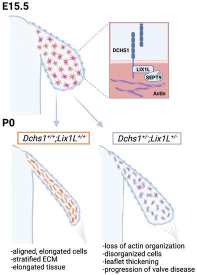 It is important to briefly note that septins are also able to interact with and regulate the microtubule cytoskeleton. As MVP has been defined as a ciliopathy, a microtubule mechanism is worthy of investigation. In particular, DCHS1 has been observed at ciliary basal bodies along the airway epithelia [56], and significant decreases in cilia lengths were observed in DCHS1 heterozygote mice at P0 [31]. Further evidence for microtubule involvement was observed in early DCHS1-deficient zebrafish embryos affecting microtubule bundling [57]. Additionally, DCHS1 was shown to interact with Ttc28 and Aurora B to control early embryonic cleavages [58] and, interestingly, the binding region was included in our DCHS1-LIX1L interacting domain. In the context of the DCHS1-LIX1L-SEPT9 protein complex presented here, LIX1L has not yet been shown to interact with or regulate microtubules. However, septins 2, 7 and 9 have been observed along ciliary axonemes and in regulation of ciliogenesis [59]. Future studies investigating whether DCHS1-LIX1L-SEPT9 converge on microtubules could prove an additional axis for cilia regulation in the valve.