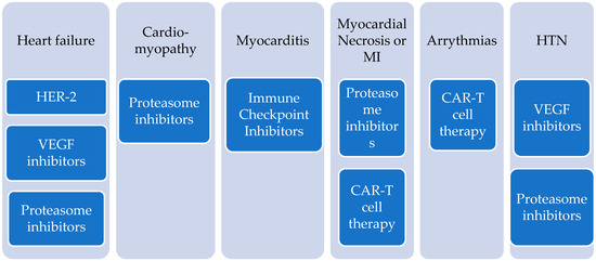 The aim of this narrative review is to discuss the main diagnostic and prognostic aspects of non-anthracycline cancer chemotherapy agents that induce cardiotoxicity, focusing most on cardiomyopathies, and to highlight primary and secondary prevention strategies (Figure 1 and Figure 2).