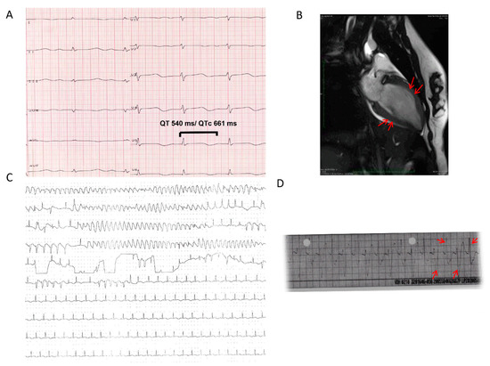 (A) ECG at TTS event of 72-year-old female patient presented prolonged QTc interval at TTS event. Due to intolerance of beta-blockers and ongoing prolonged QTc interval in regular follow-ups, an s-ICD has been implanted. A genetic screening confirmed a mutation in the KCNQ1 gene. (B) Cardiac magnetic resonance of 18-year-old female patient with a bidirectional tachycardia within the operative rhinoplasty and a family history of sudden cardiac death: aunt at 36 years old. It shows a midventricular ballooning consistent with TTS. (C) Holter ECG in the intensive care unit of a female patient with a previously diagnosed LQTS detected a recurrent ventricular tachycardia. Cardiac magnetic resonance confirmed a coexistence of apical ballooning. (D) ECG presents a bidirectional tachycardia that has terminated after 20 min.