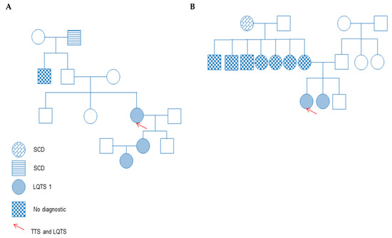 (A,B) Family pedigrees of two TTS patients affected by LQTS 1 at random after a detailed screening due persistence of ECG changes despite recovery of TTS.