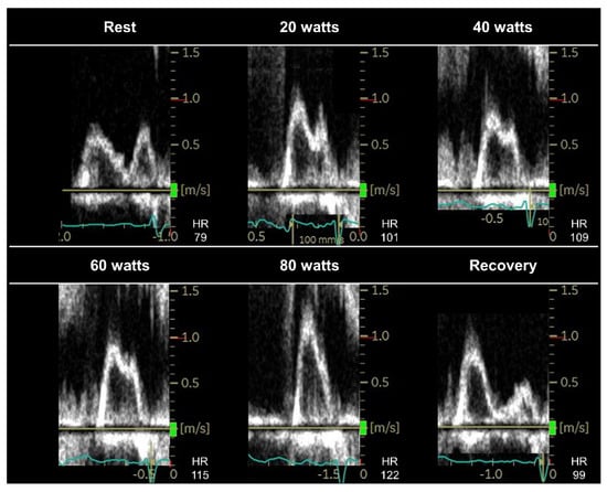 No universally adopted protocols exist for diastolic stress echocardiography. The EACVI/ASE guidelines recommend a multistage protocol, starting at 25 watts (W) at a 60 rpm cadence with the load increasing by 25 W every 3 min until peak exercise [7,20]. Other researchers have proposed a ramp stress protocol, starting at 15 W with 5 W increments every minute to a submaximal target heart rate of 100–110 bpm. During supine bicycle exercise echocardiography, echocardiographic images should be obtained at baseline, at each stage of exercise, and during the early recovery phase [7]. The advantage of image acquisition is the chance to determine the E/e′ ratio before the fusion of the mitral E and A velocities (Figure 1).