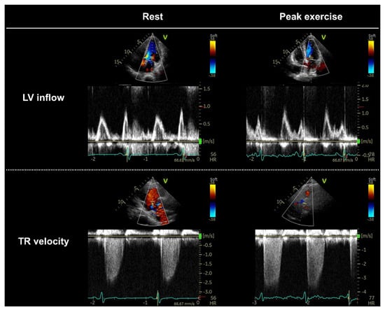 Pulmonary hypertension (PH) in HF is primarily caused by a passive elevation in downstream LV filling pressures [49]. Thus, the assessment of PH during diastolic stress echocardiography is important to evaluate the severity of increases in LV filling pressures during the stress of exercise, and this can be achieved by measuring the TRV [7,8,20]. An isolated increase in the TRV during exercise is insufficient to diagnose HFpEF because it may be secondary to pulmonary vascular disease (pre-capillary component) or high cardiac output (CO). The presence of a concomitant increase in the TRV and E/e′ ratio can increase the probability of elevated LV filling pressures [8,50,51]. Importantly, exercise-induced PH predicts poor clinical outcomes in patients with HFpEF [52,53]. The current practice in assessing PH during exercise relies on TRV alone rather than the combination of TRV and right atrial pressure (RAP) [7,8,20,54]. This may be related to the technical difficulty in imaging the inferior vena cava during exercise; however, the exclusion of RAP leads to a serious underestimation of the severity of PH during exercise in some patients in whom RAP may increase dramatically (~40 mmHg) [14,15,17,55]. Prior studies reported a close relationship between RAP and peripheral venous pressure at rest [56,57]. Our group recently demonstrated that the measurement of peripheral venous pressure may be a reliable alternative to RAP measurement during diastolic stress echocardiography [58].