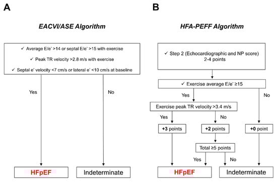 EACVI/ASE recommendations and HFA-PEFF algorithm for the diagnosis of HFpEF using exercise stress echocardiography. (A) In the EACVI/ASE recommendations, the test is considered abnormal (i.e., HFpEF) when all three criteria are met. (B) In the HFA-PEFF algorithm, the E/e′ ratio and TR velocity during exercise are used to add points to the resting HFA-PEFF score calculated in step 2. If the total score is ≥5 points, the diagnosis of HFpEF is confirmed. ASE, American Society of Echocardiography; EACVI, European Association of Cardiovascular Imaging; HFA-PEFF algorithm, a consensus-based algorithm proposed by the Heart Failure Association of the European Society of Cardiology; HFpEF, heart failure with preserved ejection fraction; TR, tricuspid regurgitation; NP, natriuretic peptide.