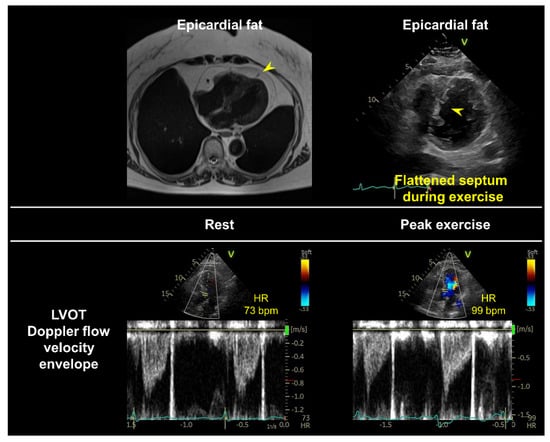 A case of cardiac output (CO) reserve limitation during exercise. A 79-year-old woman with obesity (body mass index, 30 kg/m2) was referred to our echocardiographic laboratory for the evaluation of unexplained dyspnea on exertion. Her NP levels were within the normal range (N-terminal pro-brain NP, 65 pg/mL). The results of resting echocardiography were also normal; however, cardiac magnetic resonance imaging showed remarkable epicardial fat tissue (yellow arrowhead). Diastolic stress echocardiography combined with expired gas analysis showed CO reserve limitation during exercise relative to increases in VO2 (CO, 2.9 to 3.9 L/min; VO2, 189 to 549 mL/min; CO reserve, 48%). The septum became flattened in the parasternal short-axis view during peak ergometry exercise (yellow arrowhead), suggesting that enhanced ventricular interdependence might have contributed to the CO reserve limitation due to reduction in LV preload in addition to chronotropic incompetence. LVOT, left ventricular outflow tract.