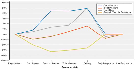 Pregnancy involves dramatic changes in cardiovascular physiology to promote increased perfusion to the uterus to meet the growing needs of the fetal–placental unit. Pregnancy-related increase in catecholamines, estrogen, and progesterone cause activation of the renin–angiotensin system that augment the cardiac output and plasma volume [6]. Other cardiovascular changes include increases in heart rate, decrease in diastolic blood pressure, increased RBC volume, and a decrease in systemic vascular resistance (Figure 2) [7]. Additionally, these physiologic changes lead to known cardiac structural and functional changes, i.e., increase in left ventricular end diastolic volume as well as ventricular mass demonstrated by echocardiography [6]. This may also result in sign and symptoms in a normal pregnancy that are like that of CVD and, therefore, diagnosis of CVD may be challenging. Not surprisingly, pregnancy is often considered a cardiovascular stress test that may worsen the pre-existing CVD or unmask a previously undiagnosed but well-compensated cardiac condition.