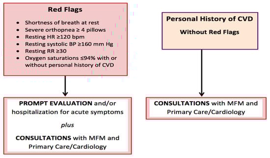 Normal physiological changes in pregnancy lead to signs and symptoms that may be indistinguishable from those of CVD. Common symptoms of pregnancy include palpitations, shortness of breath, fatigue, chest pain, and dizziness. A systematic approach is required to differentiate normal pregnancy symptoms (Table 1). Based on patient-reported symptoms, vital signs, and physical exam findings (Table 1), providers can give reassurance or triage patients for further CVD evaluation with laboratory tests (BNP, troponin) and/or other diagnostic testing (EKG, chest radiography, stress test). It is not surprising that most women who died of CVD during pregnancy and/or the postpartum period were not suspected of having a cardiac diagnosis and symptoms were attributed to an alternate diagnosis. Roughly 84% of pregnant patients who died from CVD presented with symptoms concerning for cardiopulmonary disease. However, only 61.1% of these patients were referred to Cardiology, and, of those, only 7% were referred antenatally. The overlap of signs and symptoms of normal pregnancy with those of CVD further complicates timely diagnosis. About 60.9% of CVD-related maternal deaths were found to be due to delayed response from healthcare providers [8].