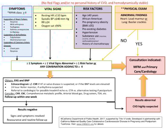 California Maternal Quality Care Collaborative (CMQCC) algorithm to identify red flags in pregnant and postpartum patients that would prompt further cardiovascular disease evaluation.