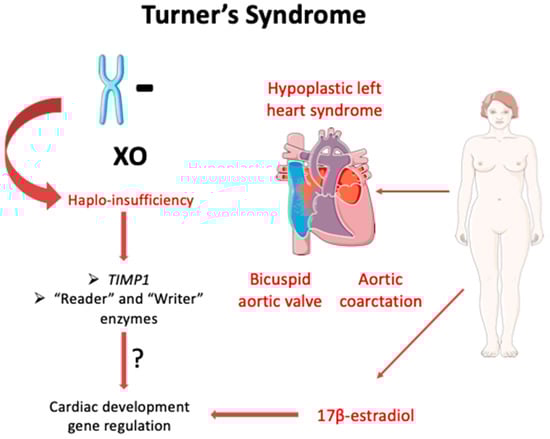 Complete or partial loss of one X chromosome in TS is associated with cardiac abnormalities. These dysfunctions vary, with hypoplastic left heart syndrome being the most common among patients with TS. Multiple factors related to the missing X chromosome have been associated with the TS phenotype. Haplo-insufficiency of TIMP1, “reader” and “writer” enzymes, and abnormalities in 17β-estradiol production are only part of a general genetic and hormonal instability observed in patients with TS. Figures were produced using Servier medical art.
