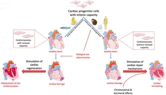 Animal models of cardiac regeneration provide evidence linking the capacity for cardiac regeneration with sexual maturation and reproduction. In this context, animals with plastic sexual phenotypes demonstrate full cardiac regenerative capacity [21,22]. These species are either hermaphrodites or are capable of switching phenotypic sex in response to environmental and genetic factors, such as temperature and steroid hormones [23,24]. On the other hand, in gonochoristic species with non-plastic sexual phenotypes, such as humans, sex determination and cardiomyogenesis occur exclusively during embryonic development [20]. In these species, cardiac regenerative capacity is extinguished soon after birth [25]. Intriguingly, some gonochoristic species, such as zebrafish, which are born as hermaphrodites before undergoing irreversible sex determination in their early larval life [26], retain lifelong cardiac regenerative capacity. Therefore, understanding the mechanisms that link sex determination and reproduction to cardiac regenerative capacity is of paramount importance to the field of cardiac regenerative medicine.