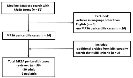We performed a systematic review of the literature according to Preferred Reporting Items for Systematic Reviews and Meta-Analyses (PRISMA) guidelines using PubMed/Medline (National Library of Medicine, Bethesda, MD) database, from database inception until 02/01/2022. A total of 56 original articles were found that mention MeSH terms: “Methicillin-resistant Staphylococcus aureus AND pericarditis” OR “MRSA AND pericarditis.” We excluded cases where the diagnosis was not certain either because pericardiocentesis was not performed or pericardial fluid was sterile. The flow chart of detailed article selection and the final cases included in the analysis is illustrated in Figure 1.